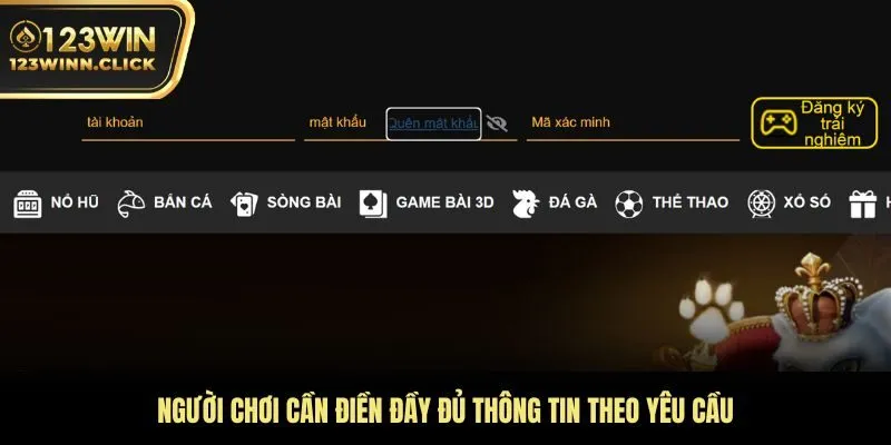 Điền thông tin đăng nhập 123WIN và xác nhận