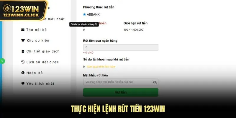 Trên giao diện rút tiền 123WIN sẽ hiển thị rõ trong tài khoản game của bạn còn bao nhiêu tiền. Lưu ý điền con số trong ô yêu cầu dưới mức hiện tại thì gửi lệnh lên trang web mới xét duyệt thành công. Tránh trường hợp thao tác không đúng liên tục bị thông báo thất bại giao dịch.